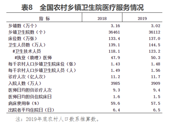 2019年底,全国3.02万个乡镇共设3.6万个乡镇卫生院,床位137.0万张,卫生人员144.5万人(其中卫生技术人员123.2万人)。与上年比较,乡镇卫生院减少349个(乡镇撤并后卫生院合并),床位增加3.6万张,人员增加5.4万人。2019年,每千农村人口乡镇卫生院床位达1.48张,每千农村人口乡镇卫生院人员达1.56人(见表8)。