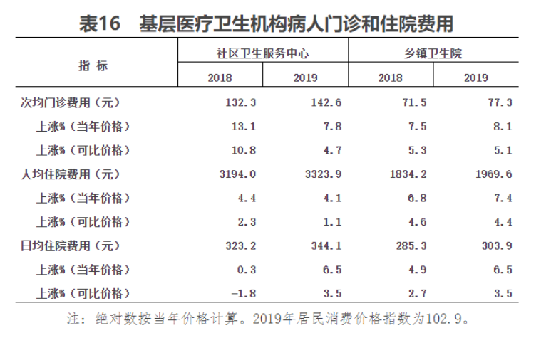 关于基层医疗卫生机构病人医药费用。2019年,社区卫生服务中心次均门诊费用142.6元,按当年价格比上年上涨7.8%,按可比价格上涨4.7%;人均住院费用3323.9元,按当年价格比上年上涨4.1%,按可比价格上涨1.1%(见表16)。