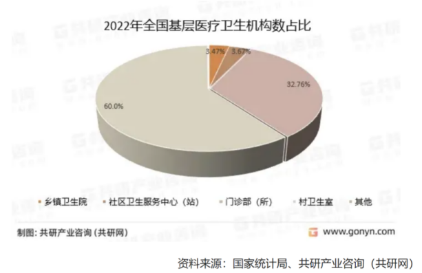其中,乡镇卫生院3.4万个,占基层医疗卫生机构的3.47%;社区卫生服务中心(站)3.6万个,占基层医疗卫生机构的3.67%;门诊部(所)32.1万个,占基层医疗卫生机构的32.76%;村卫生室58.8万个,占基层医疗卫生机构的60%。