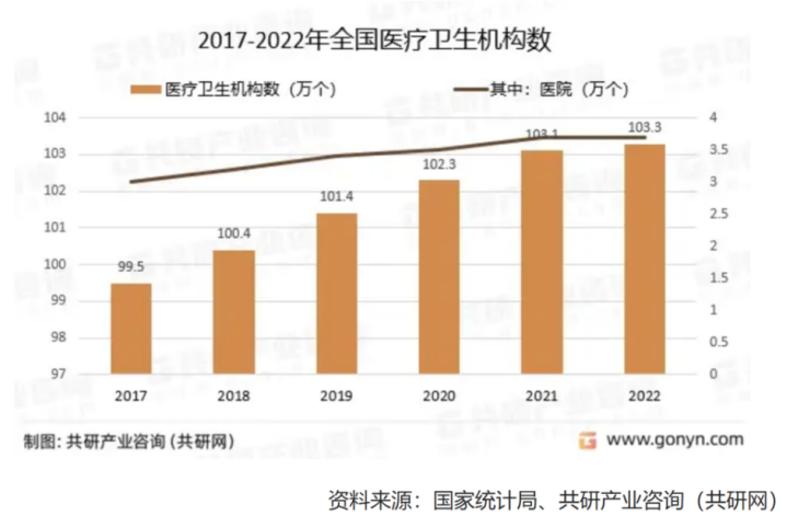 截止到2022年年末,全国共有医疗卫生机构103.3万个,较我基金会项目开展时间(2020年)增加1万个,其中医院3.7万个,占医疗卫生机构的3.58%,在医院中有公立医院1.2万个,占医院的32.43%;民营医院2.5万个,占医院的67.57%。(作者:bili_32421001073 https://www.bilibili.com/read/cv23133732)