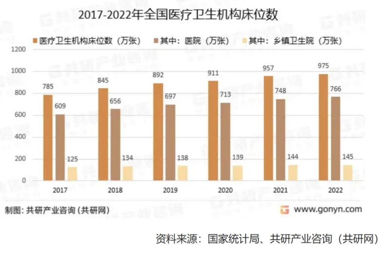 截止到2022年年末,全国共有医疗卫生机构床位975万张,较我基金会项目开展时间(2020年)增加64万张,其中医院766万张,占医疗卫生机构床位的78.6%;乡镇卫生院145万张,占医疗卫生机构床位的14.9%。