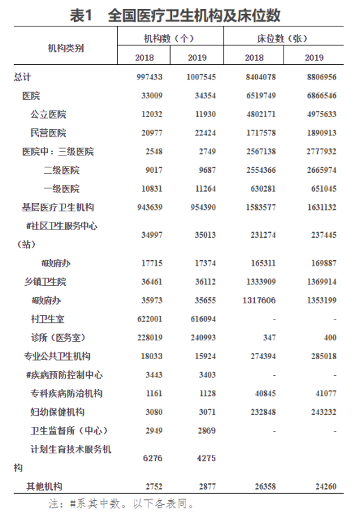 据国家卫生健康委发布的《2019年我国卫生健康事业发展统计公报》统计(以下表格信息源自搜狐网https://www.sohu.com/a/400871817_100005717):