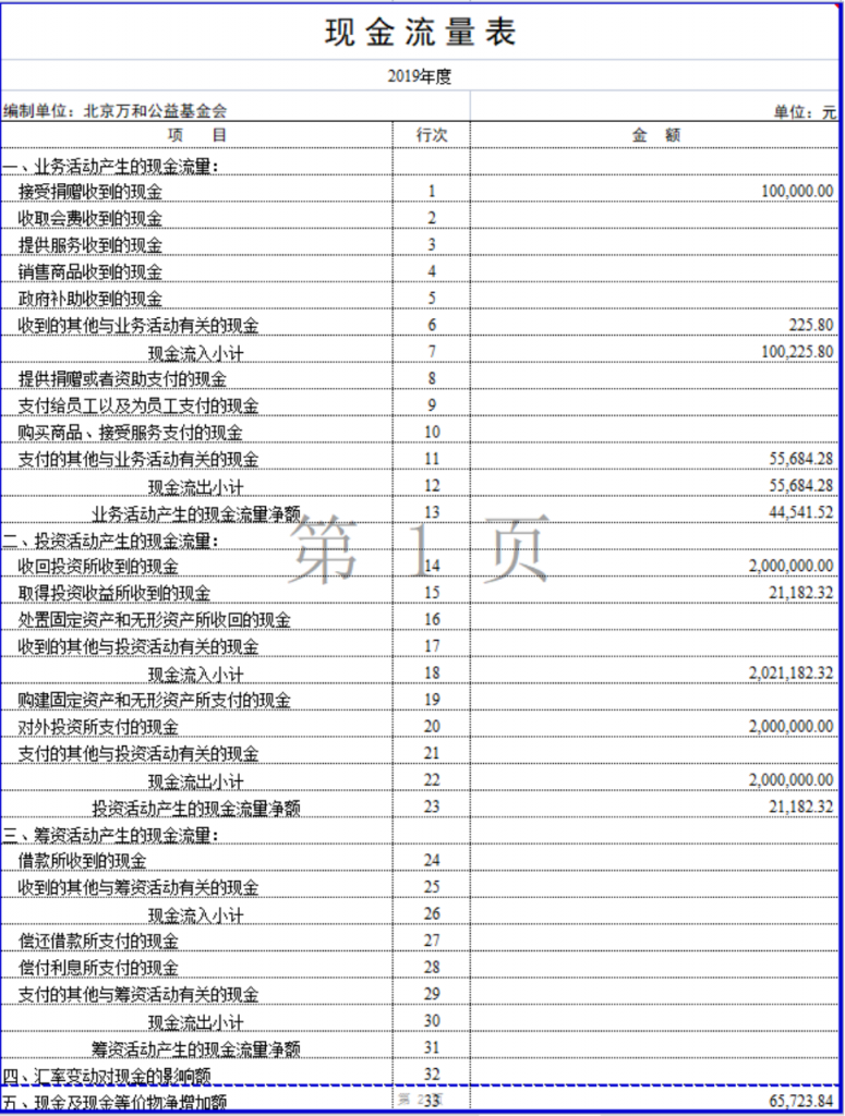 基金会财务情况从2019年01月01日至2019年12月31日止,财务管理工作情况正常,业务活动和捐赠款收支等运转状况正常。根据财务执行情况汇总,报告如下: