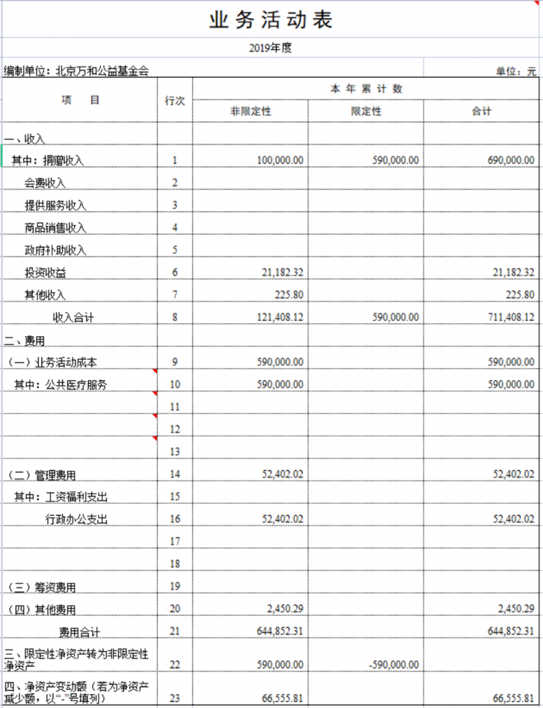 2019年度净资产变动额为66,555.81元;收入合计金额为711,408.12元,其中:捐赠收入690,000.00元,投资收益21,182.32元,其他收入225.80元。费用合计为644,852.31元,其中:业务活动成本金额合计为590,000.00元,管理费用金额合计为52,402.02元,其他费用金额合计为2,450.29元,共结余66,555.81元,导致净资产增加66,555.81元。