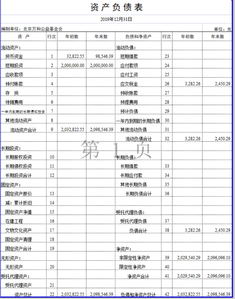 北京万和公益基金会截止2019年12月31日资产总额2098546.39元,其中:货币资金98546.39元,对外投资2000000元,应收款项0元,固定资产原值0元,累计折旧0元,固定资产净值0元。
