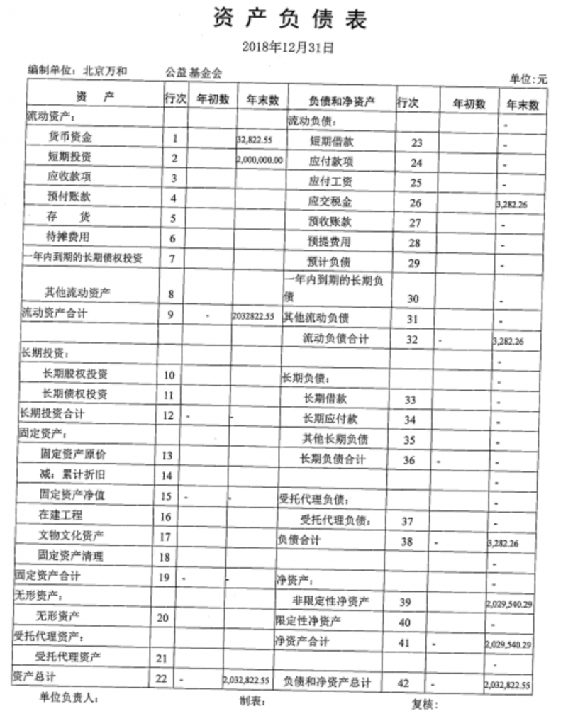 北京万和公益基金会截止2018年12月31日资产总额2032822.55元,其中:货币资金30822.55元,对外投资2000000元,应收款项0元,固定资产原值0元,累计折旧0元,固定资产净值0元。