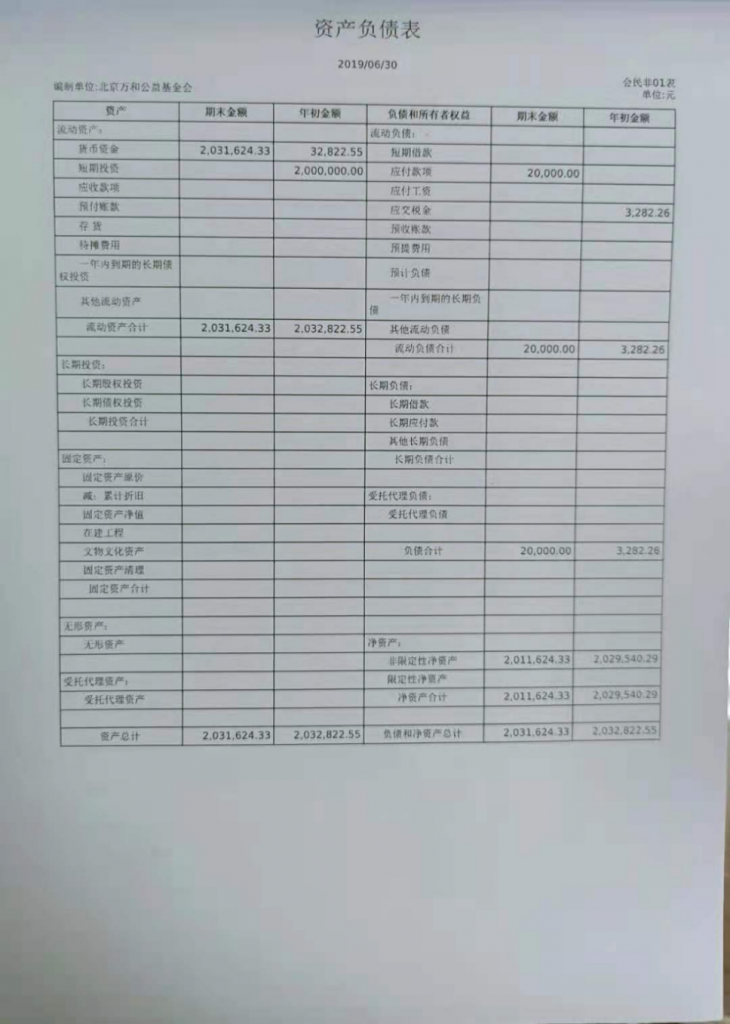北京万和公益基金会截止2019年6月30日资产总额31624.33元,其中:货币资金31624.33元,对外投资2000000元,应收款项0元,固定资产原值0元,累计折旧0元,固定资产净值0元。