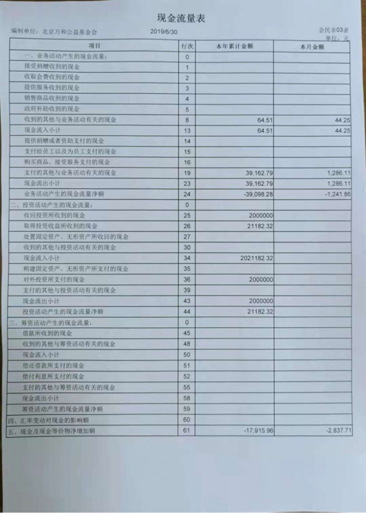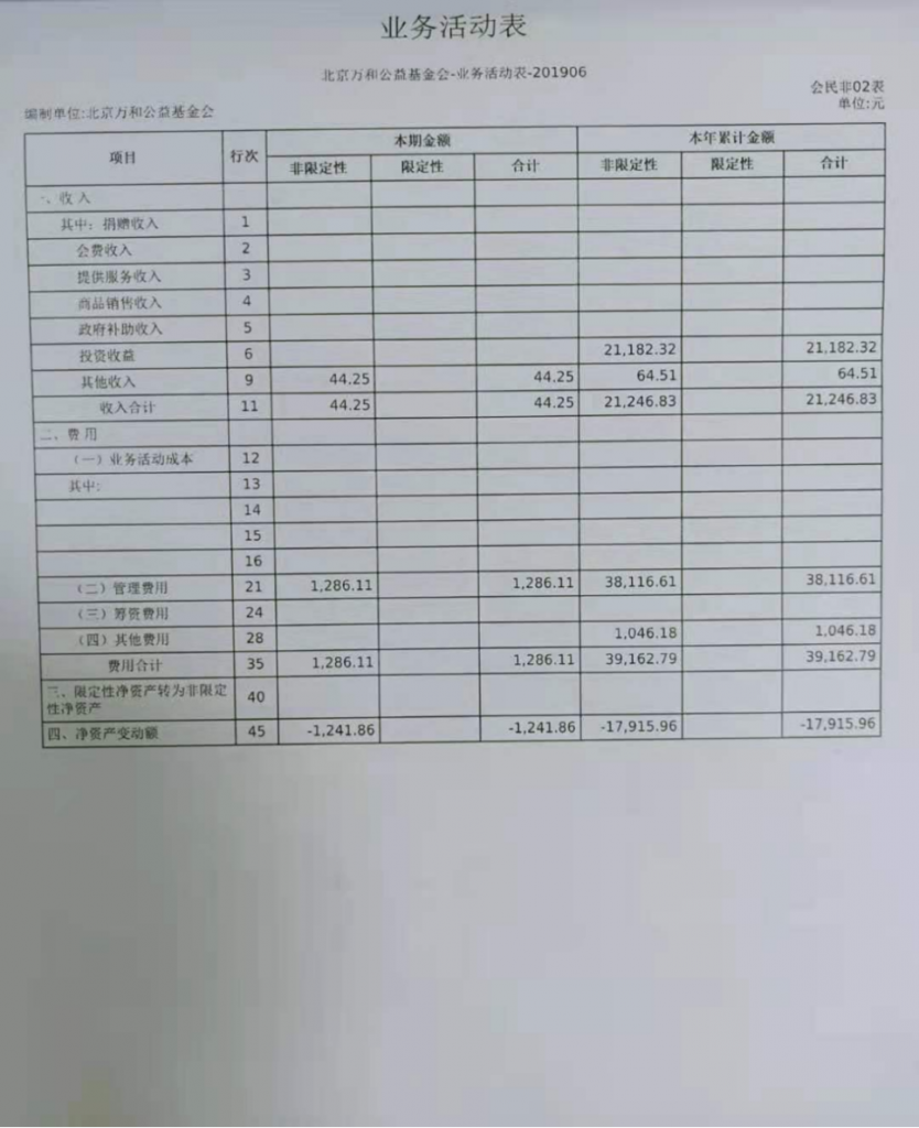 基金会财务情况从2019年01月01日至2019年06月30日止,财务管理工作情况正常,业务活动和捐赠款收支等运转状况正常。根据财务执行情况汇总,报告如下: