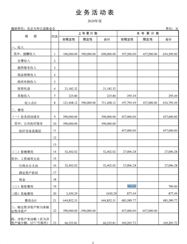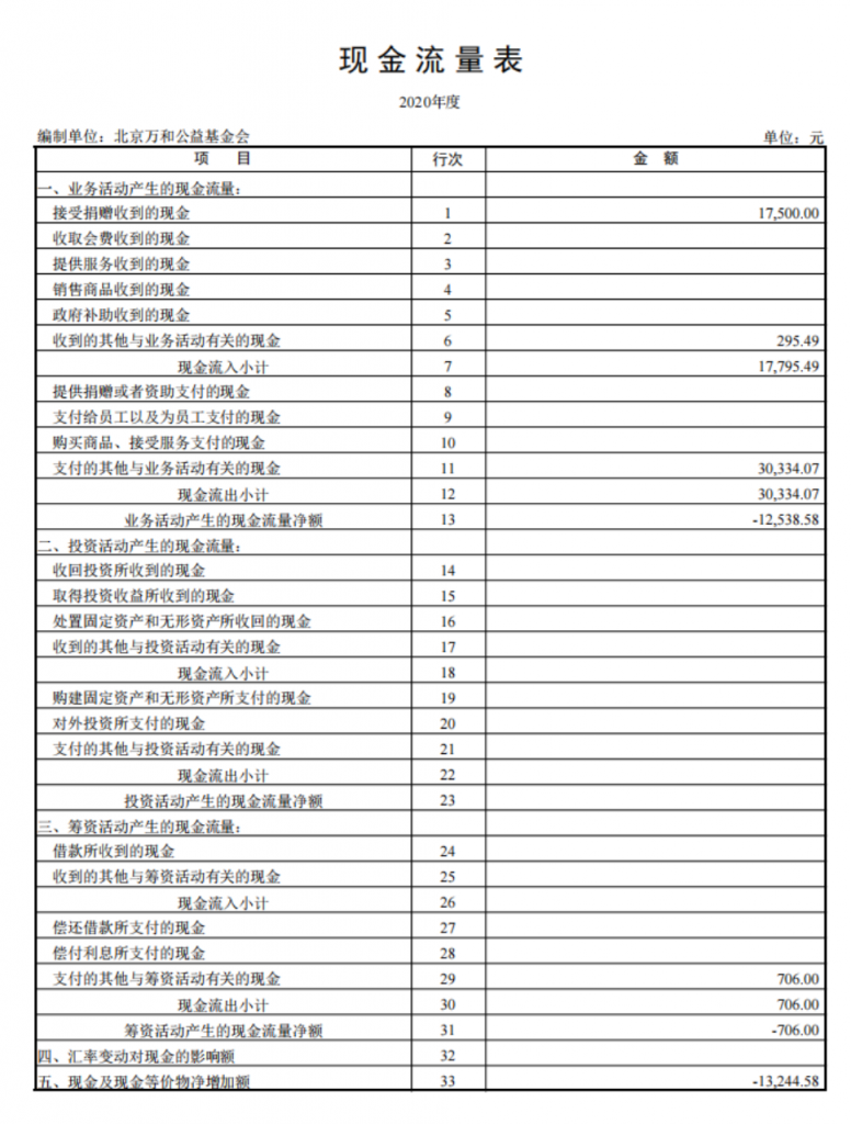 基金会财务情况从2020年01月01日至2020年12月31日止,财务管理工作情况正常,业务活动和捐赠款收支等运转状况正常。根据财务执行情况汇总,报告如下: