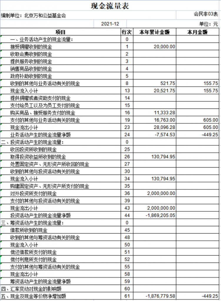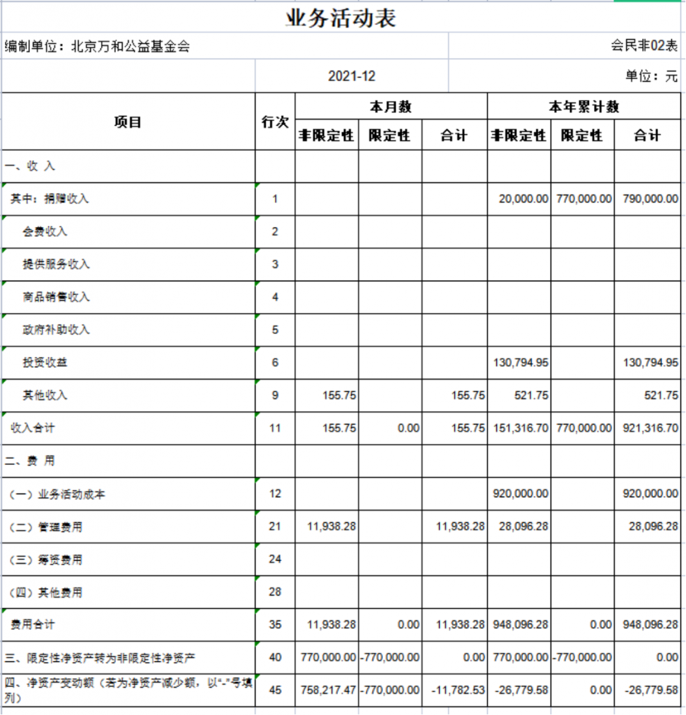基金会财务情况从2021年01月01日至2021年12月31日止,财务管理工作情况正常,业务活动和捐赠款收支等运转状况正常。根据财务执行情况汇总,报告如下: