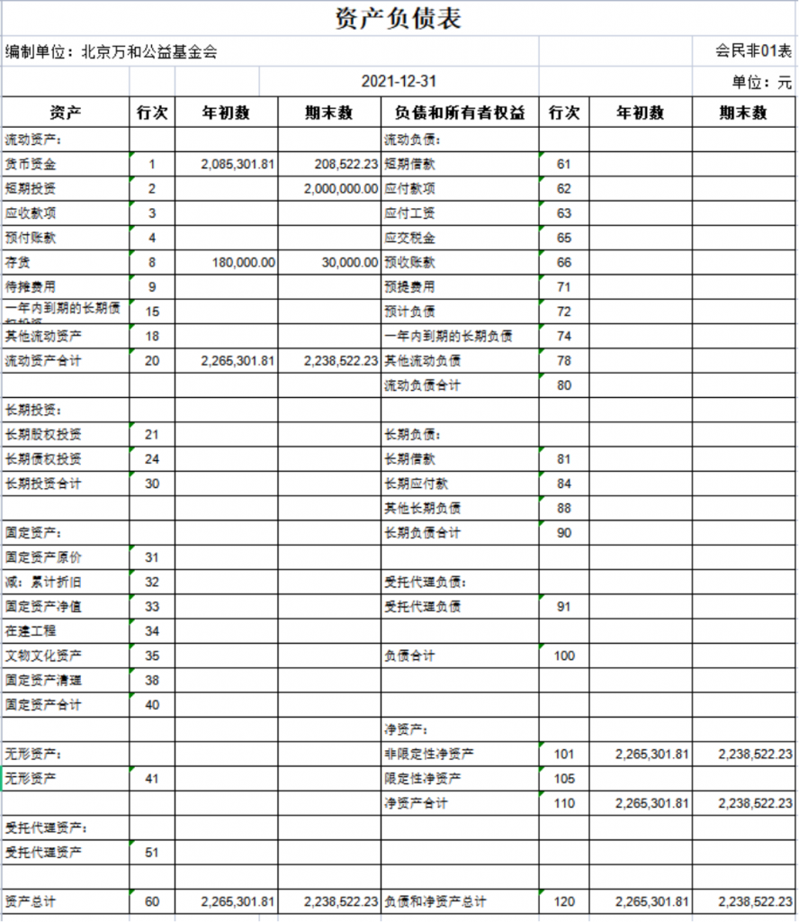 北京万和公益基金会截止2021年12月31日资产总额2238522.23元,其中:货币资金208522.23元,对外投资2000000元,应收款项0元,存货30000元,固定资产原值0元,累计折旧0元,固定资产净值0元。