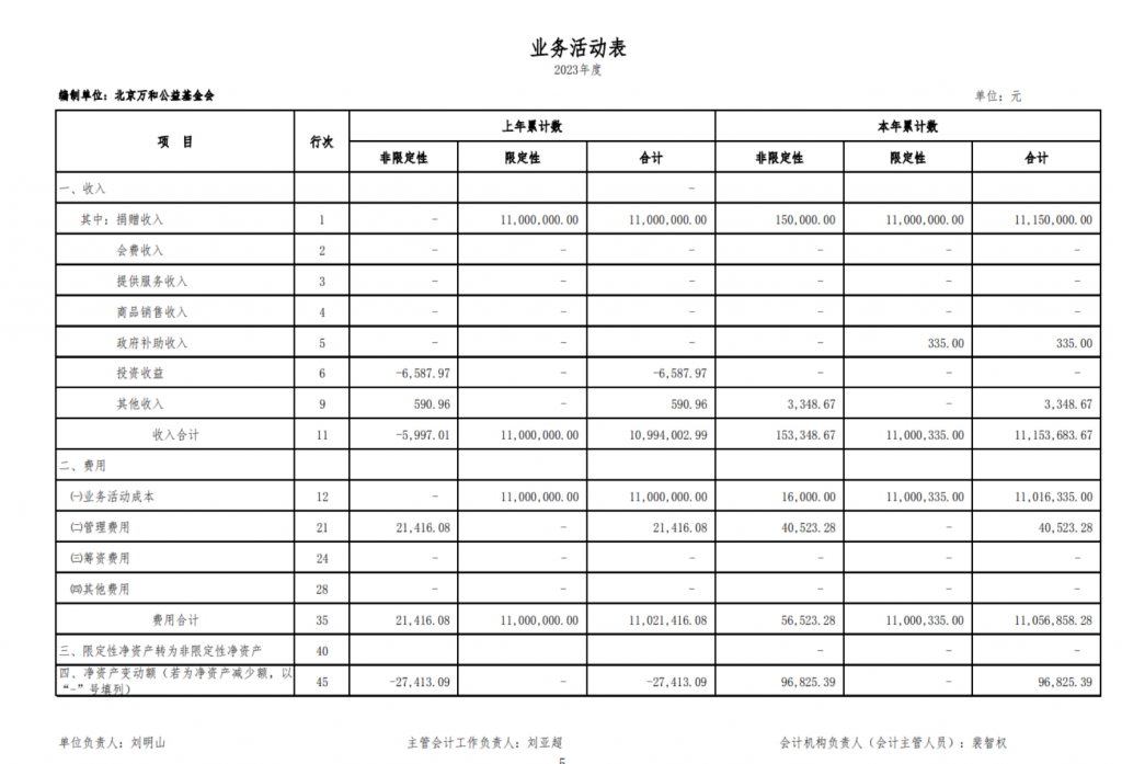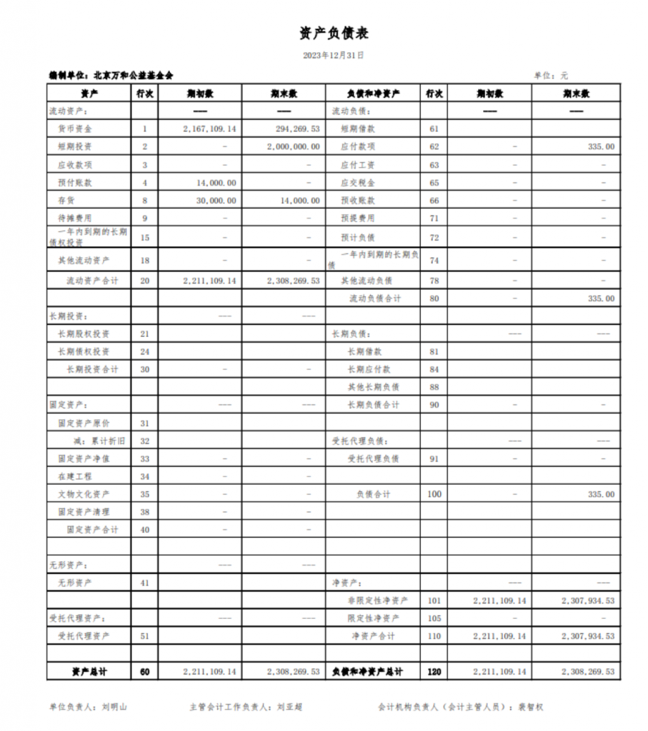 3、按照国家有关规定和上级主管部门指示,基金会于2023年01月25日接受了北京东审会计师事务所(特殊普通合伙)的审计,出具标准无保留意见,认为北京万和公益基金会财务报表已经按照《基金会登记管理条例》和《民间非营利组织会计制度》的规定编制,在所有重大方面公允反映了北京万和公益基金会2023年12月 31日的财务状况以及 2023年的业务活动成果和现金流量。